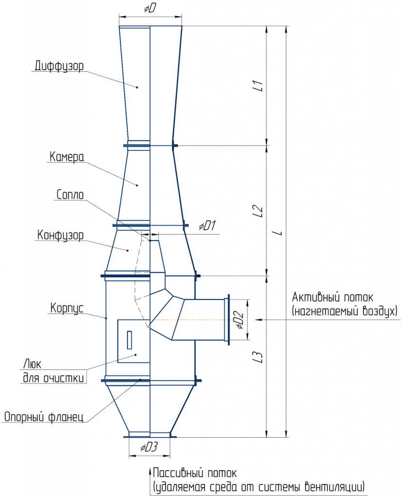Конструктивно ЭИ представляет полую колонну с парубком для подачи эжектирующего воздуха и всасывающим патрубком. Внутри колонны монтируется сопло для повышения эффективности процесса. Смешивание нагнетающего воздушного потока с удаляемой средой осуществляется в камере оборудования, за снижение скорости и повышение статического давления отвечает диффузор. Для обслуживания (прочистки) сопла в корпусе устройства предусмотрен ревизионный люк (люк для очистки). ЭИ изготавливаются из углеродистой стали , так же в зависимости от заказа (от типа удаляемой среды) могут быть из низколегированной стали, окрашенываются коррозионностойким лакокрасочным покрытием.