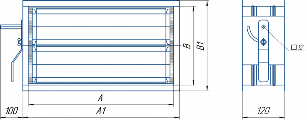 Корпус и поворотные створки клапана ВК изготавливаются из алюминиевого профиля. По стандарту клапана идут в универсальном исполнении с рукоятью для ручного регулирования и площадкой под электропривод. Для герметичности в местах соприкосновения ламелей установлен резиновый уплотнитель. Стандартная ширина ламели 100мм, при заказе клапанов сечением не кратное 100мм в нижней части клапана устанавливается дополнительный профиль.